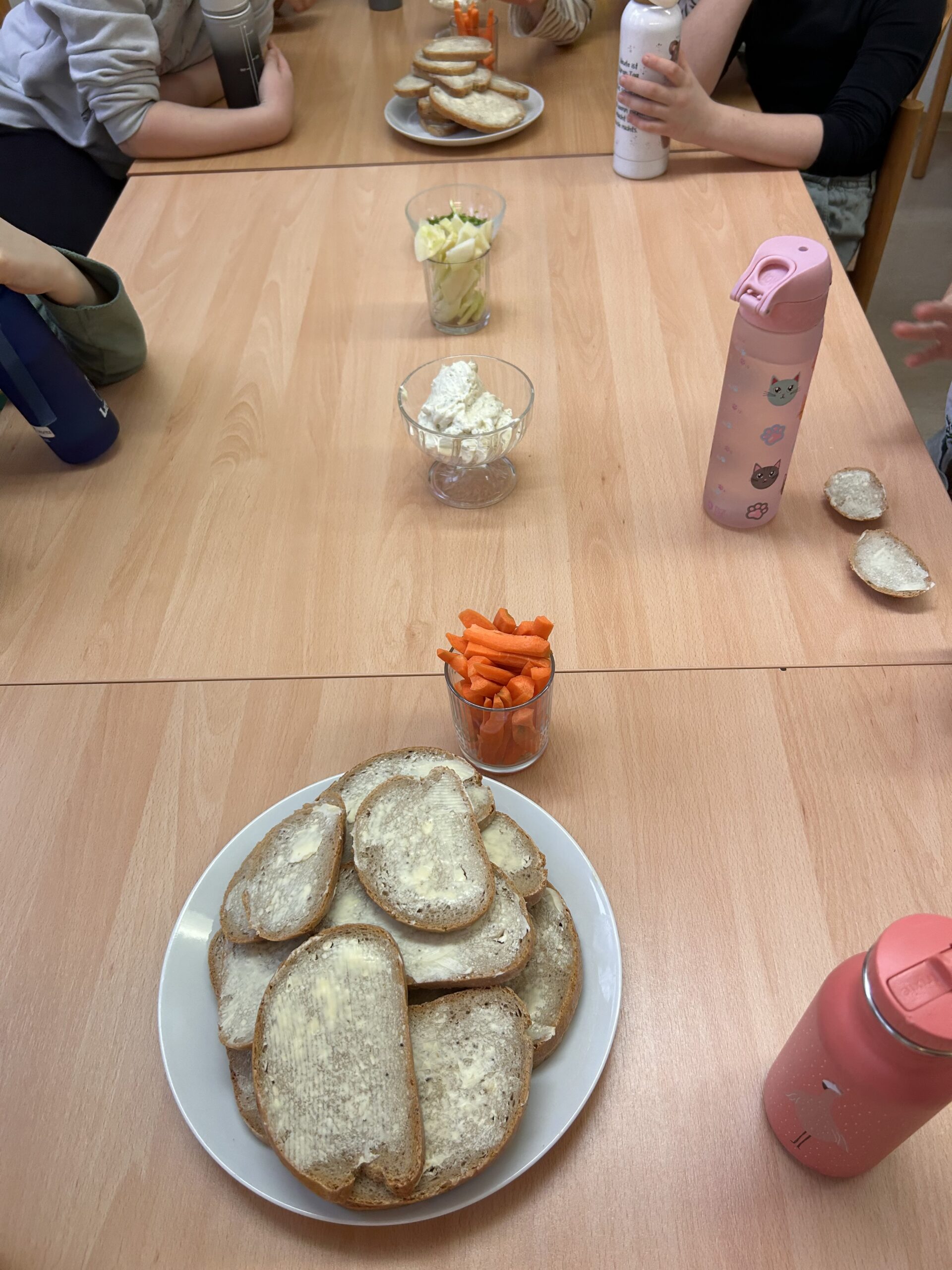 Gemeinsam haben die Schülerinnen und Schüler Obst und Gemüse geschält und geschnitten, um ein buntes Obstbuffet vorzubereiten. Außerdem wurden leckere Butterbrote geschmiert und mit frischem Schnittlauch garniert. Als gesunde Snacks gab es verschiedene Aufstriche sowie knackige Karotten- und Kohlrabisticks.