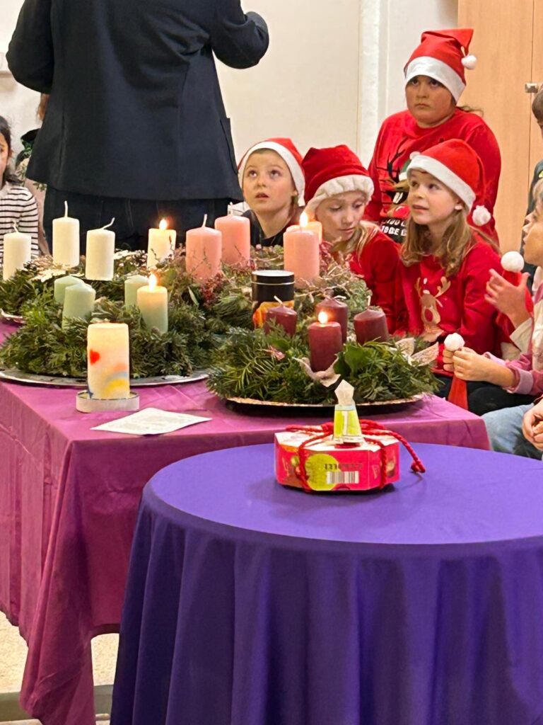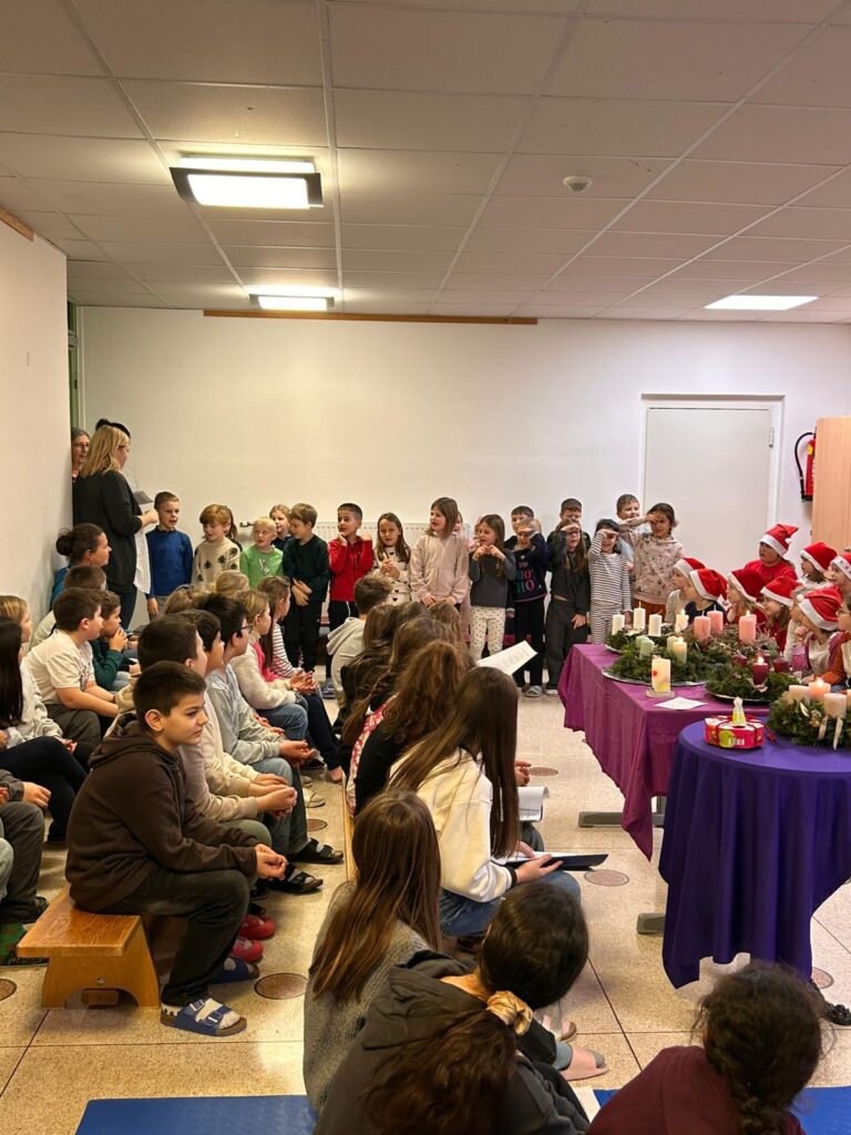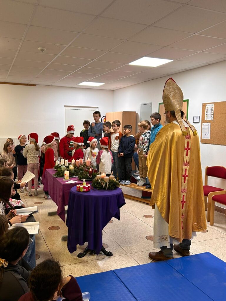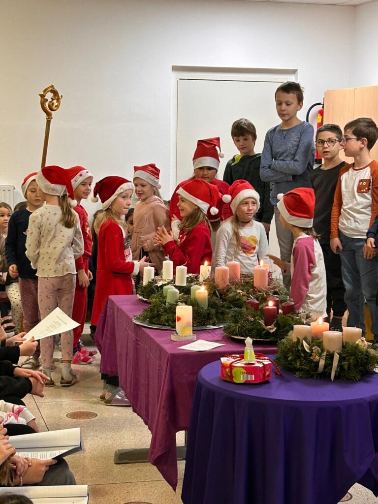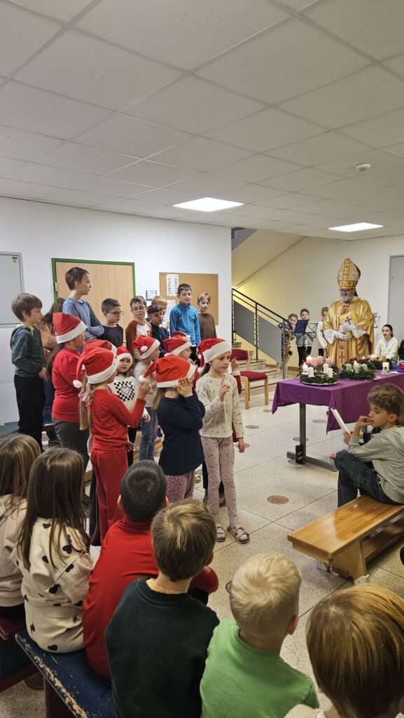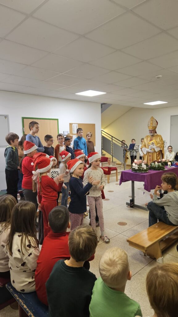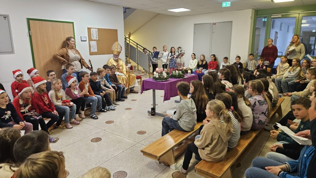 Zur Eröffnung sang die ganze Schule gemeinsam „Wir sagen euch an, den lieben Advent“. Anschließend wurde der Nikolaus herzlich begrüßt und bekam einen Platz angeboten.