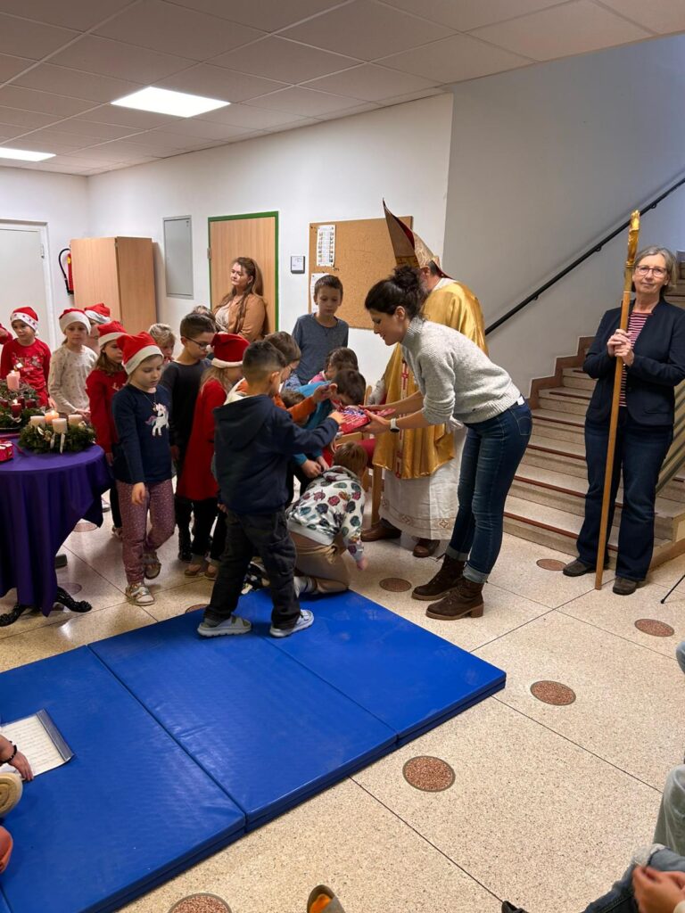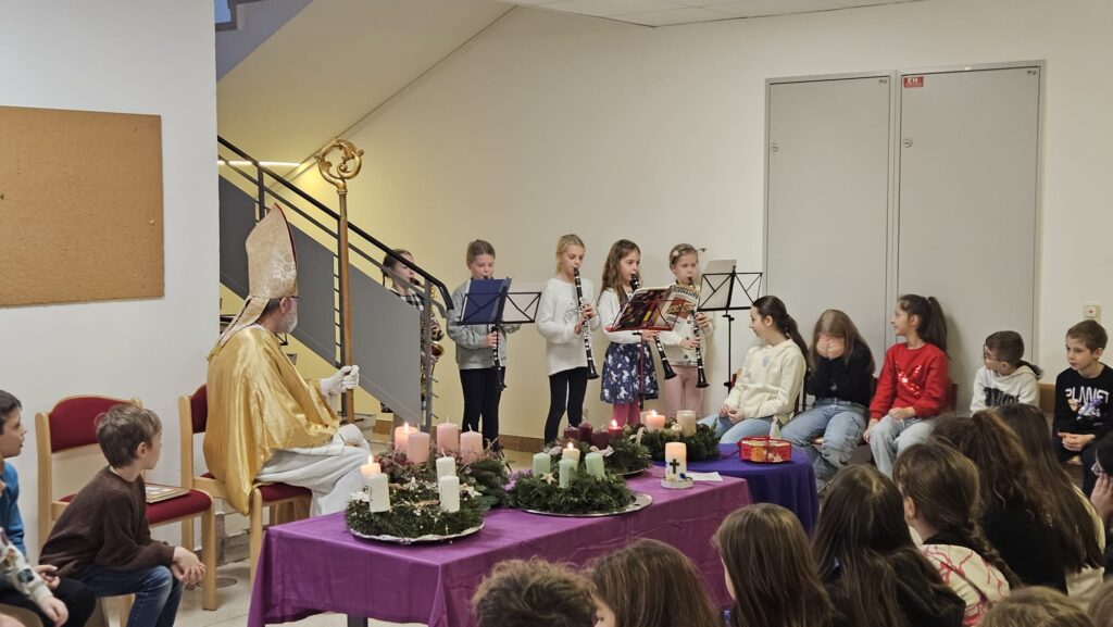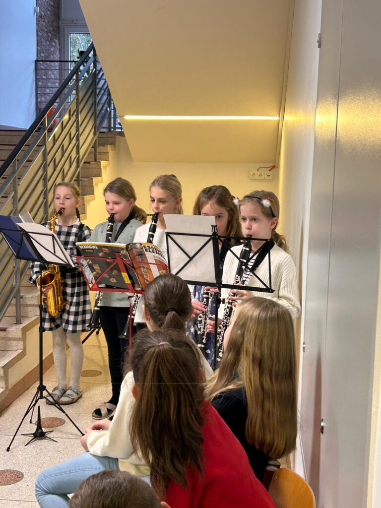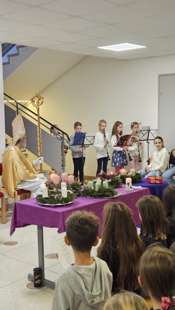 Ein besonderes Highlight war die Bläsergruppe: Vier Klarinettistinnen und eine Saxofonspielerin spielten – bereits nach knapp acht Wochen Musikunterricht – ein kleines Nikolauslied vor. Das beeindruckte sowohl den Nikolaus als auch alle Kinder und Lehrkräfte.