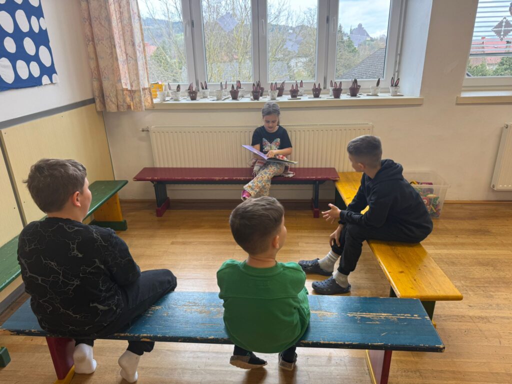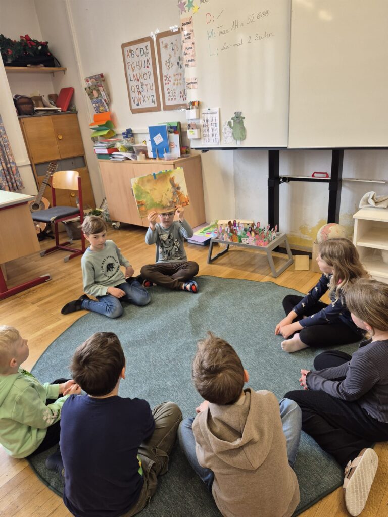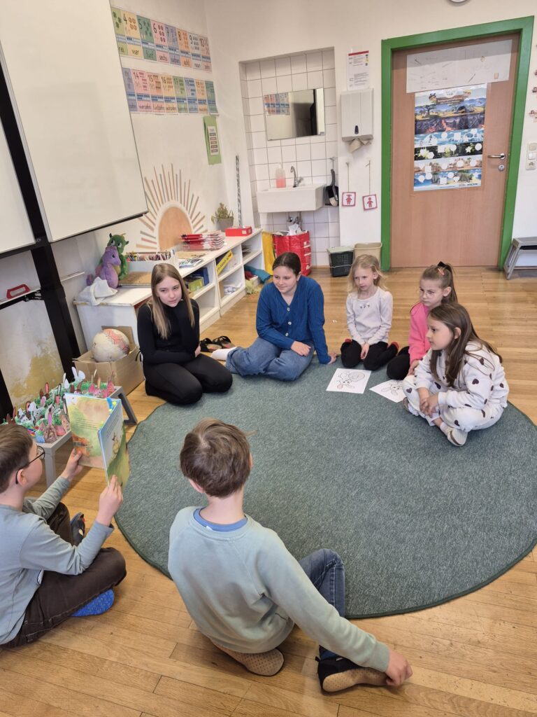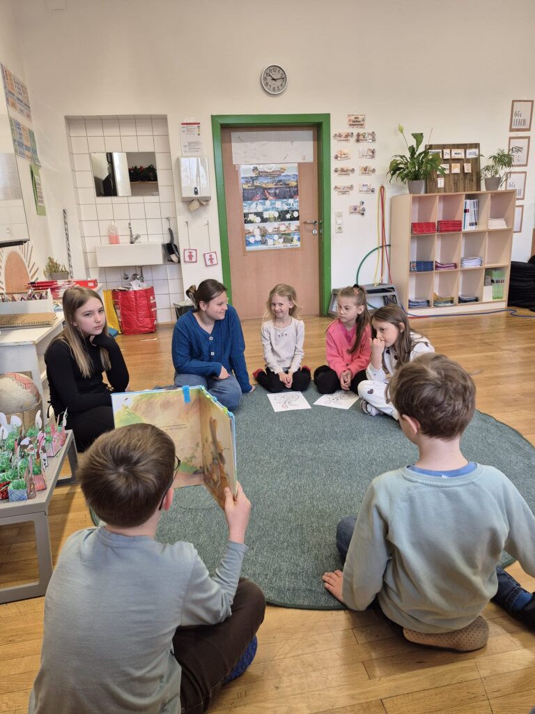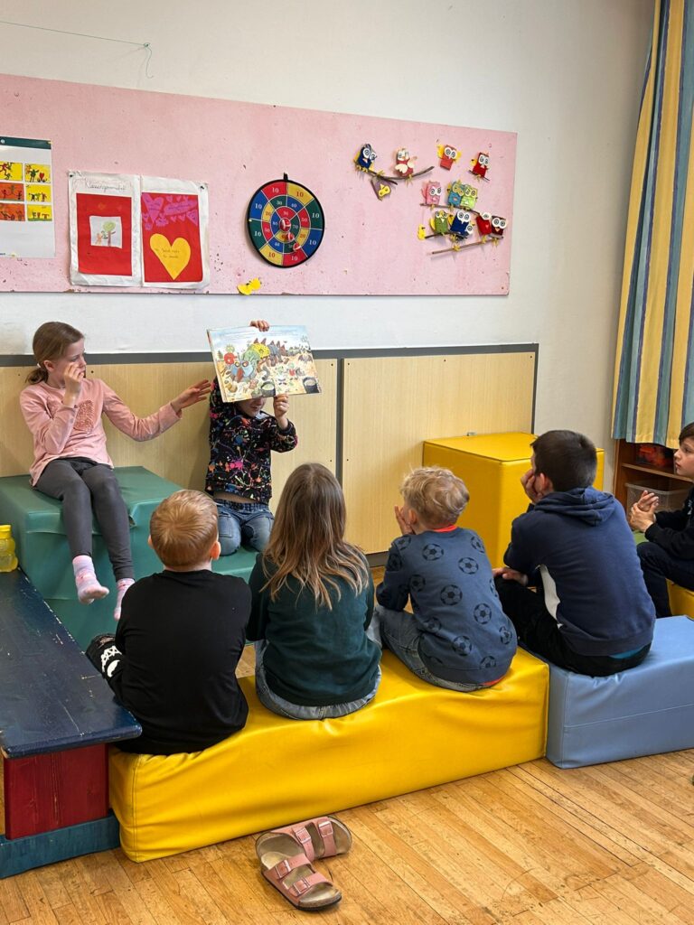 Ein besonderes Highlight war der Besuch der 3b im Kindergarten. Die Schülerinnen und Schüler lasen den Schulanfängerinnen und Schulanfängern sowie den jüngeren Kindern aus liebevoll ausgewählten Bilderbüchern vor. Mit viel Einfühlungsvermögen und Freude gestalteten sie diese Vorlesezeit und zauberten den Kindern ein Lächeln ins Gesicht.
