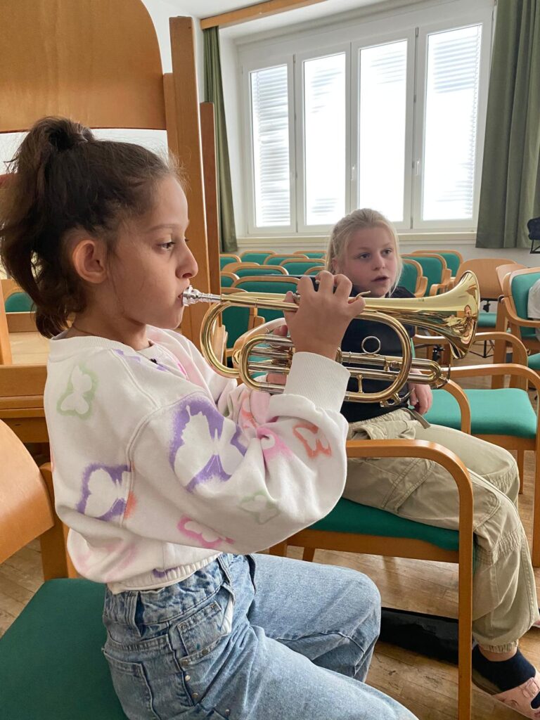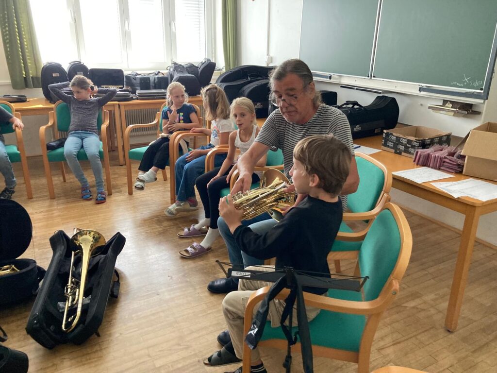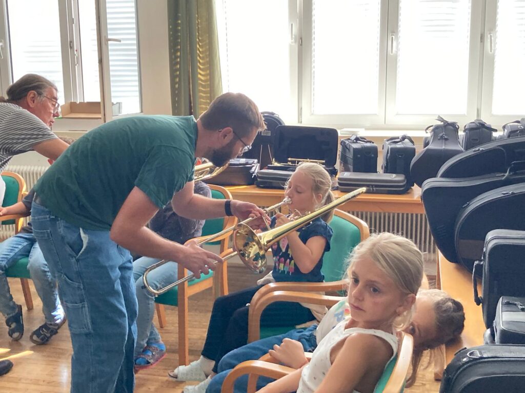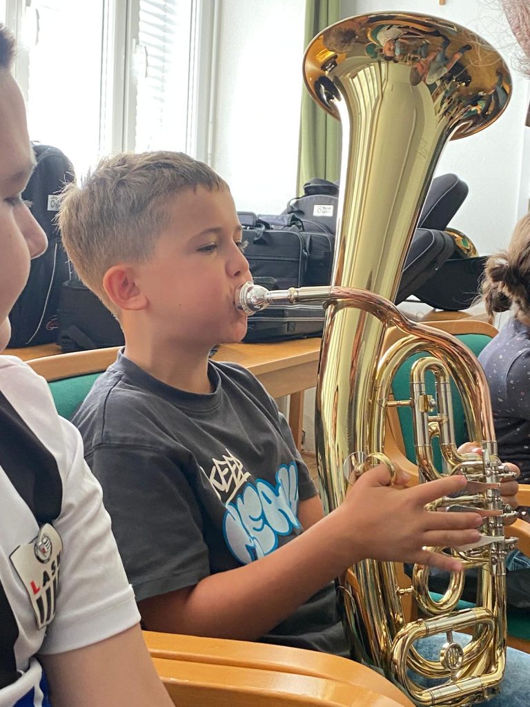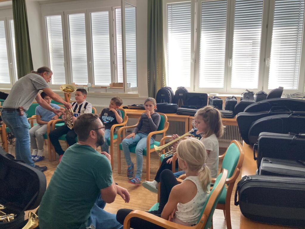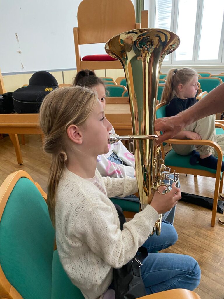 Voller Begeisterung wurden die Instrumente gleich ausprobiert – unterstützt von erfahrenen Blasmusikant:innen der Marktmusikkapelle Aschach, die den Kindern mit Rat und Tat zur Seite standen.