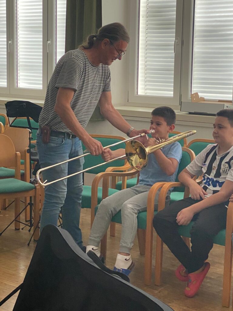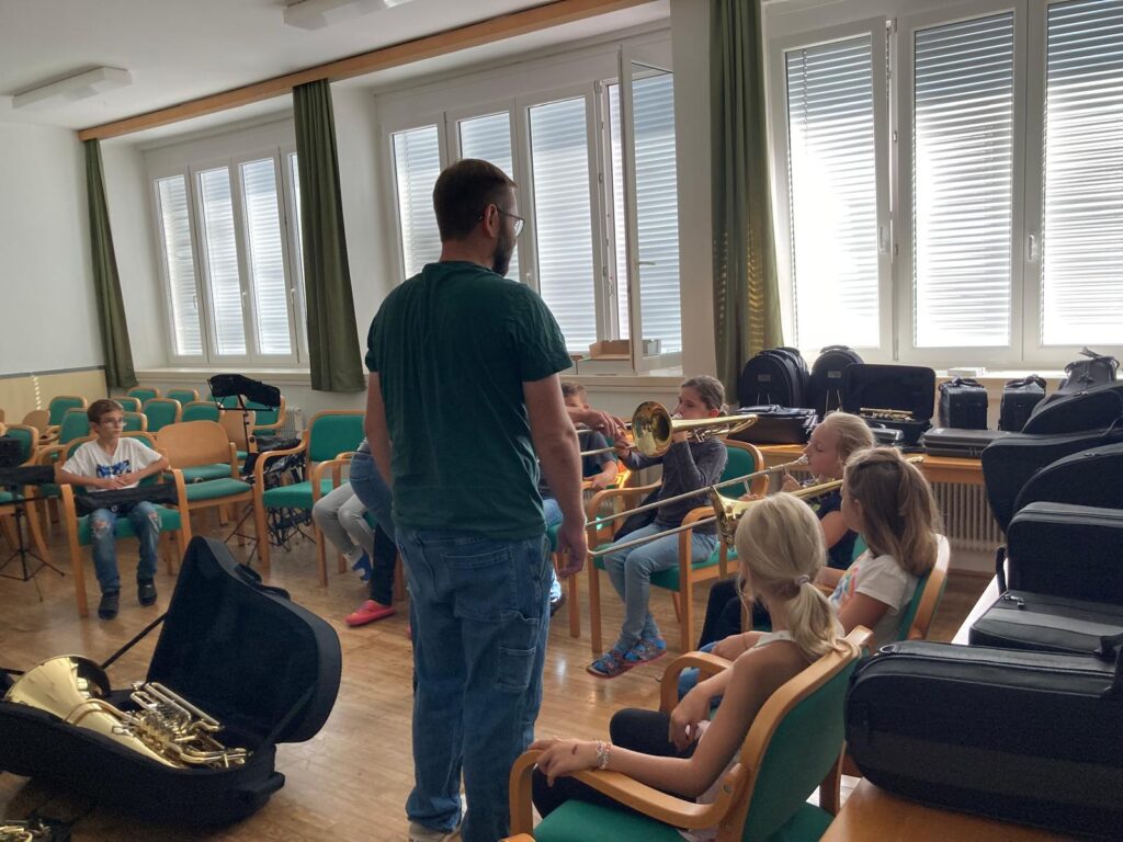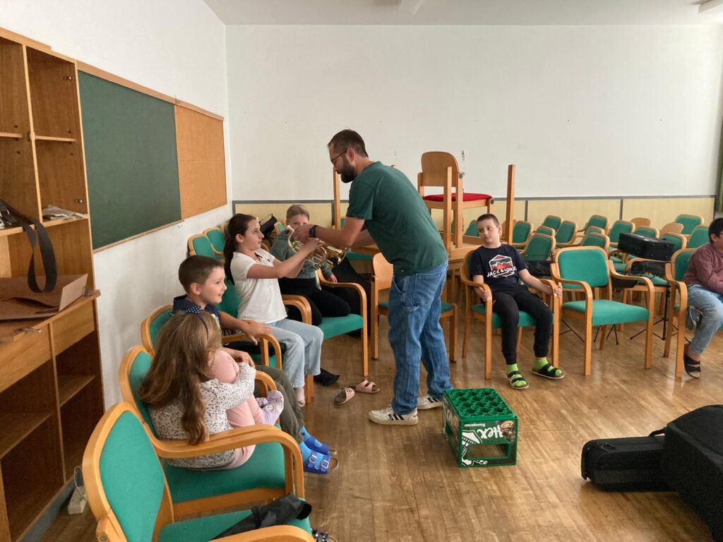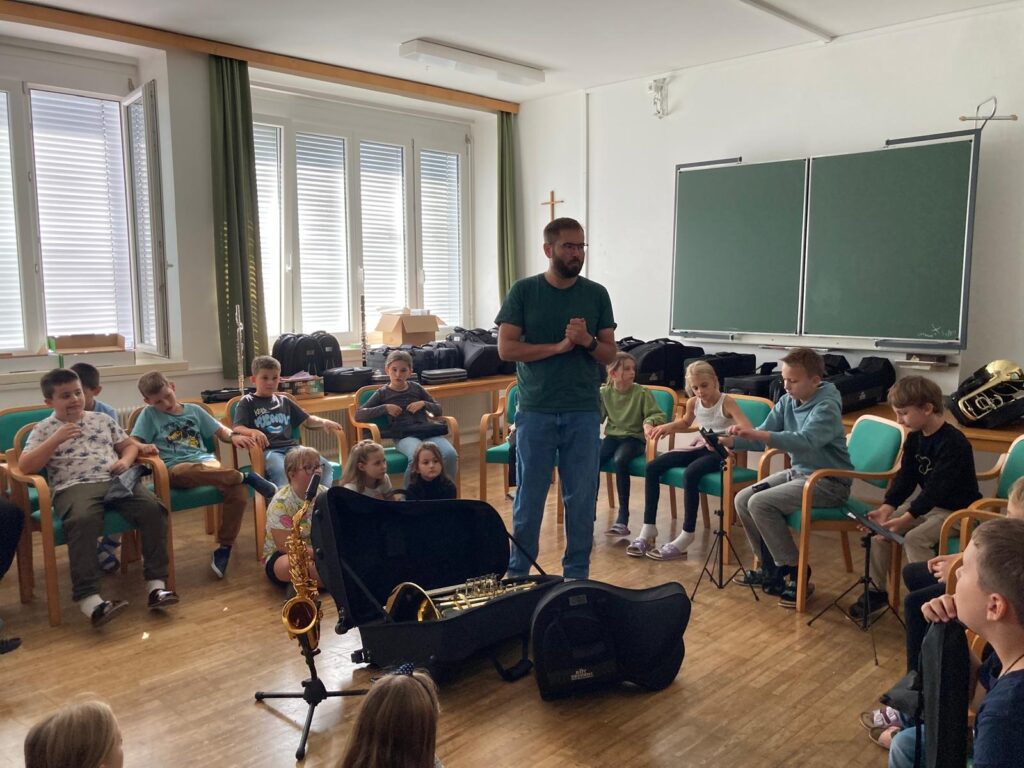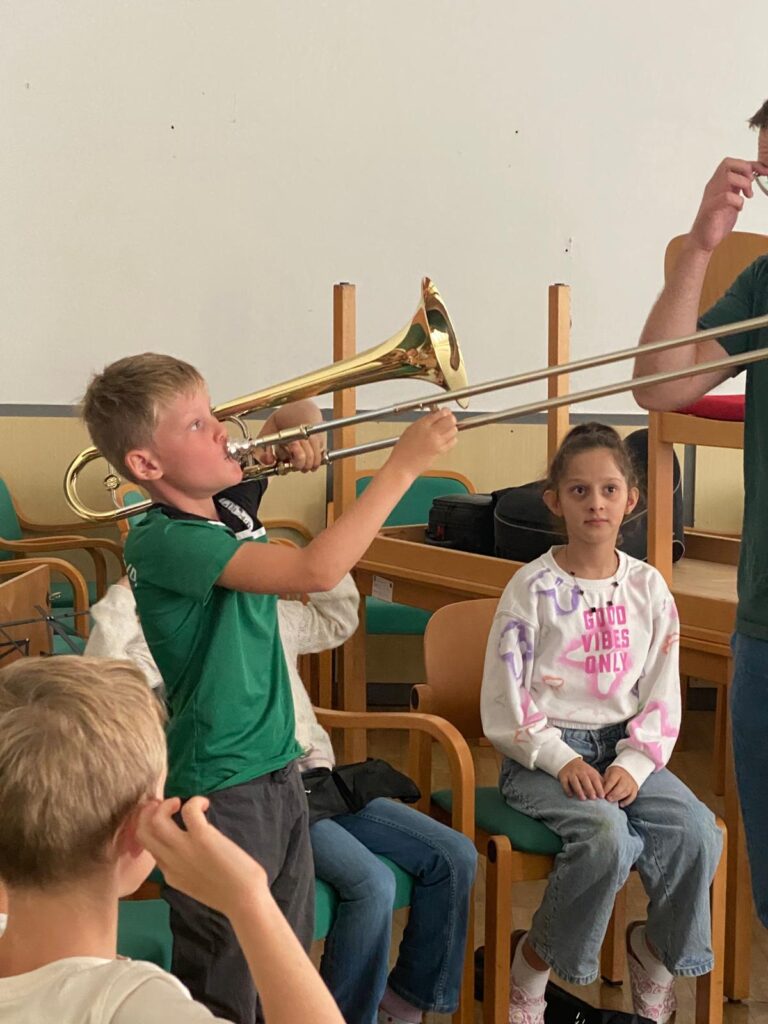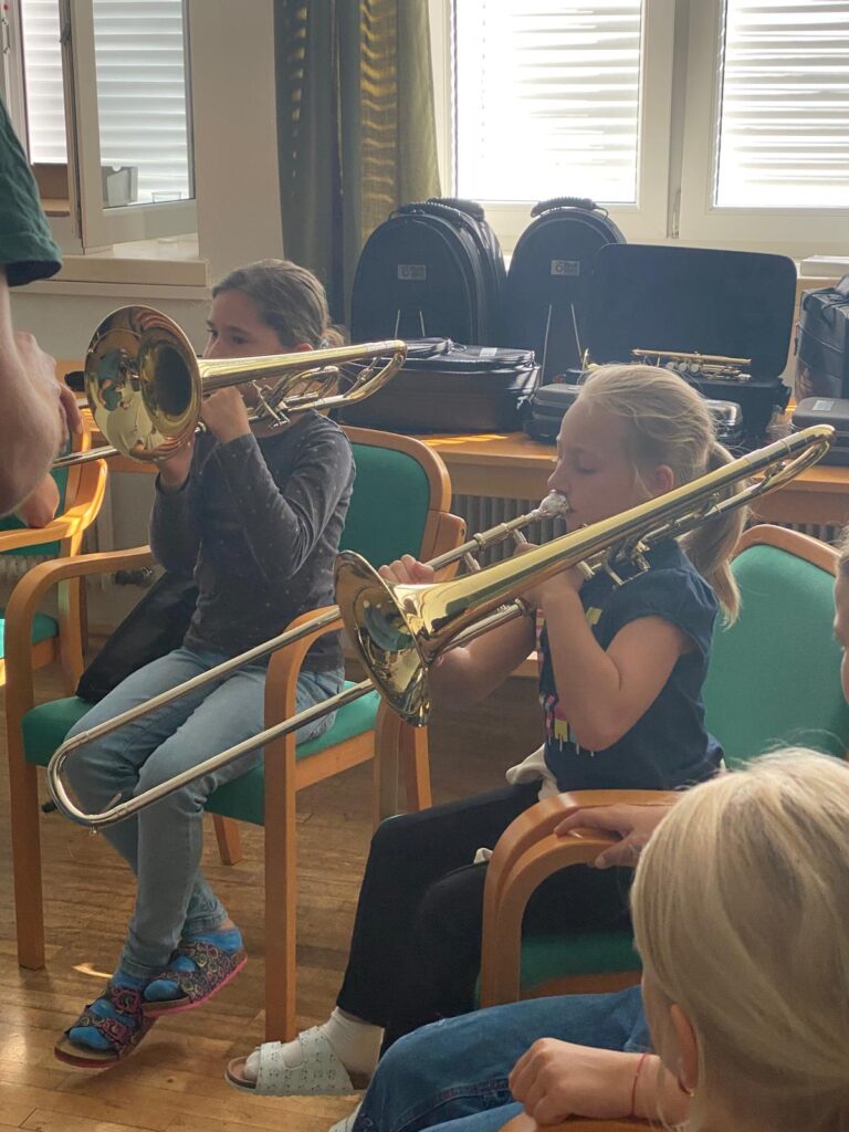 Voller Begeisterung wurden die Instrumente gleich ausprobiert – unterstützt von erfahrenen Blasmusikant:innen der Marktmusikkapelle Aschach, die den Kindern mit Rat und Tat zur Seite standen.