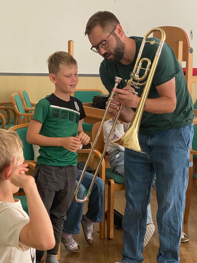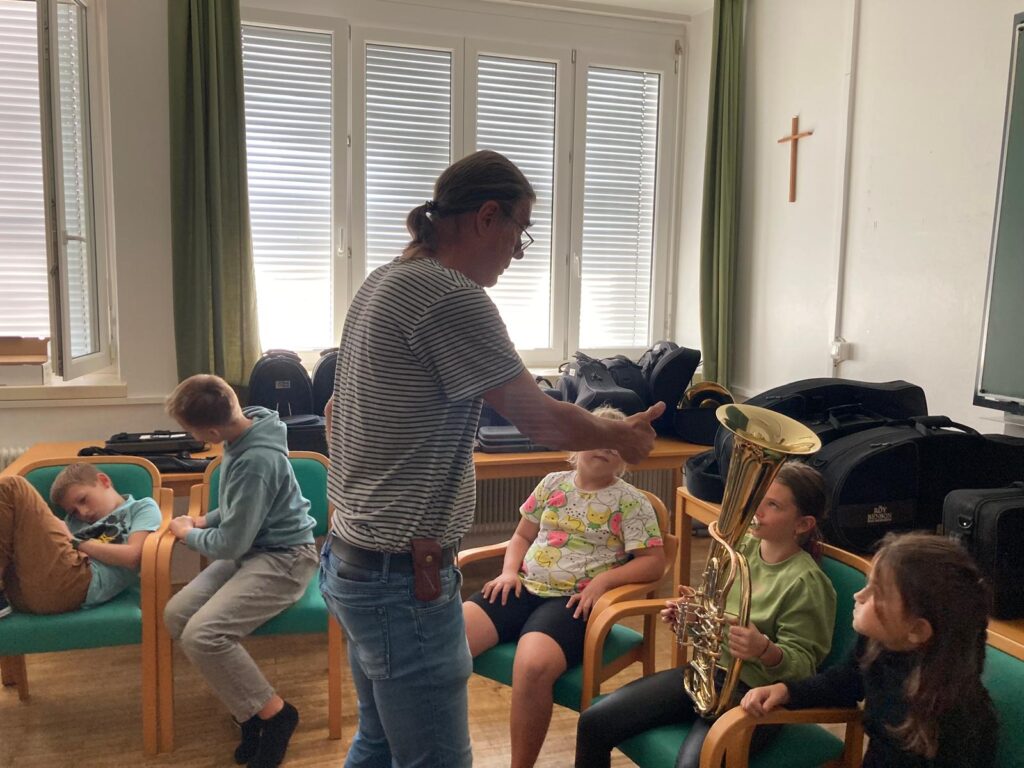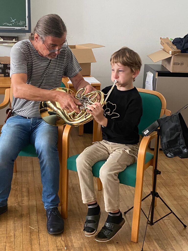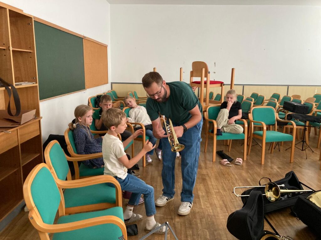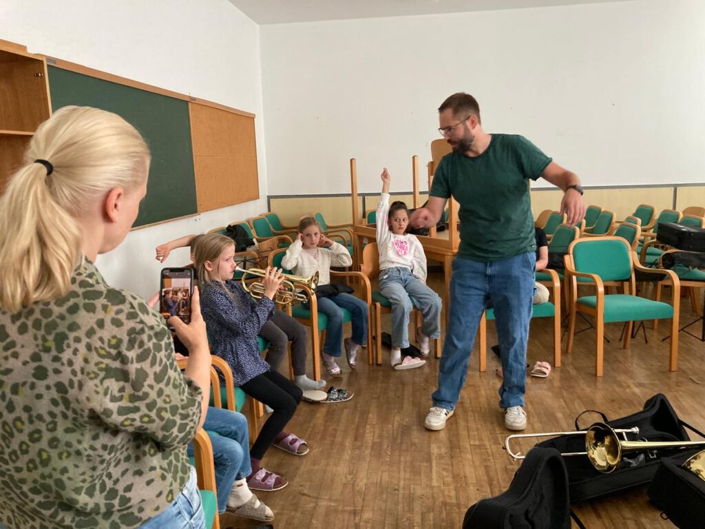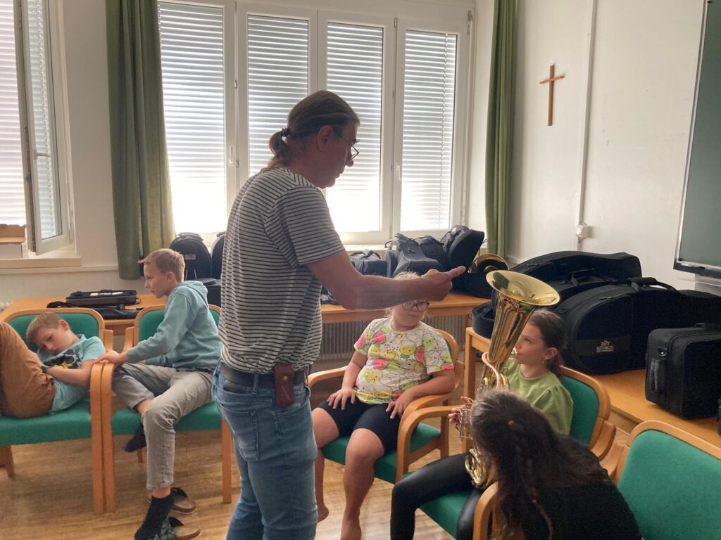 Voller Begeisterung wurden die Instrumente gleich ausprobiert – unterstützt von erfahrenen Blasmusikant:innen der Marktmusikkapelle Aschach, die den Kindern mit Rat und Tat zur Seite standen.