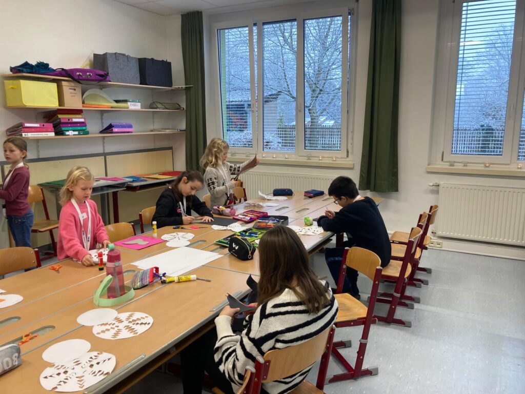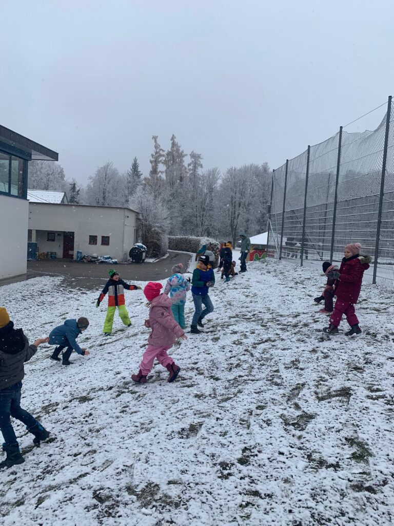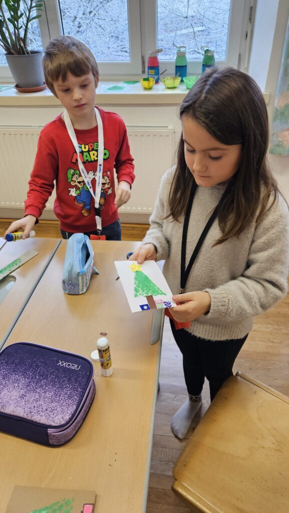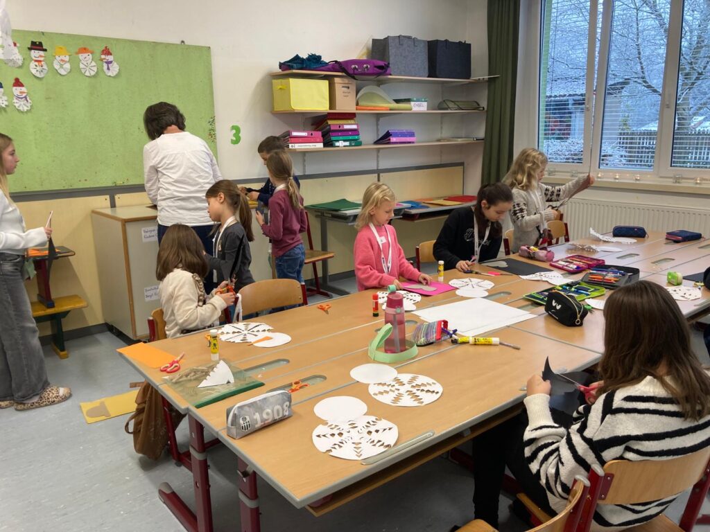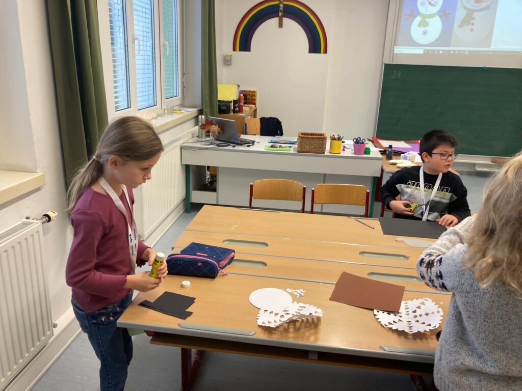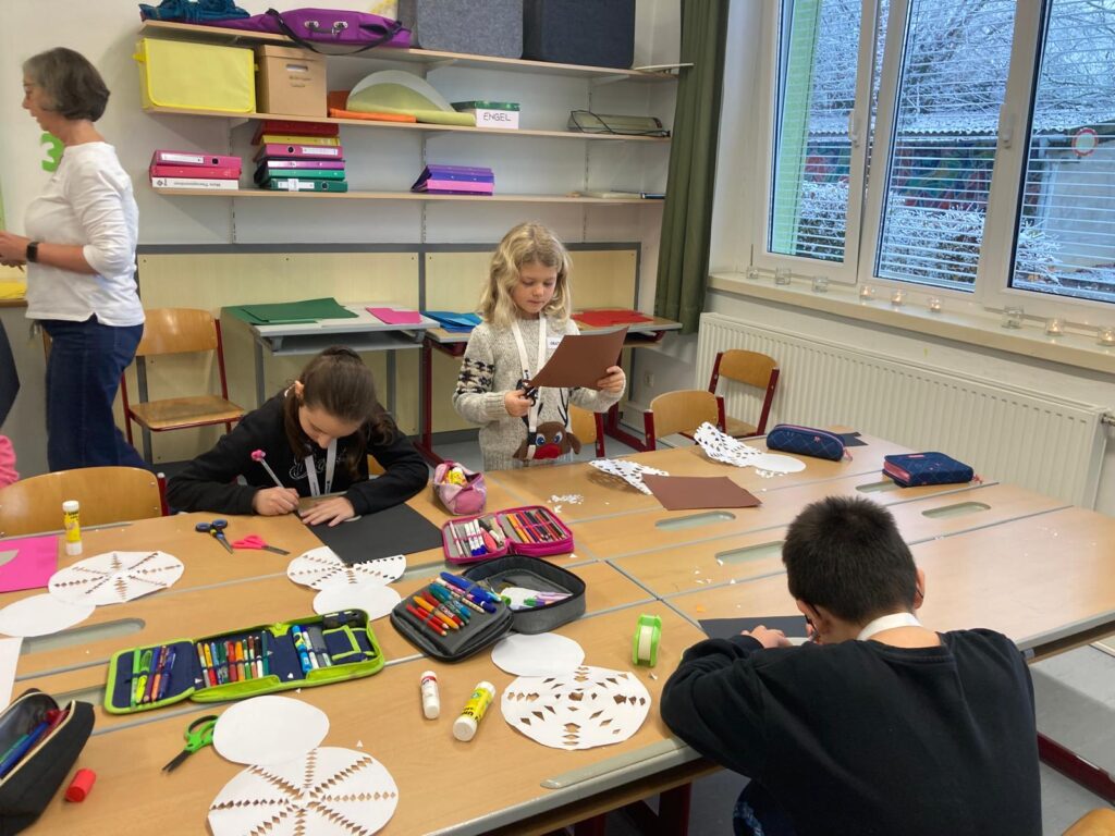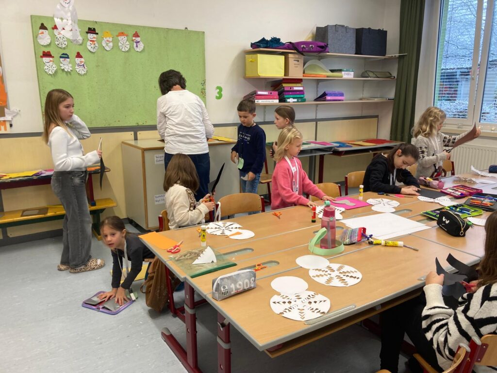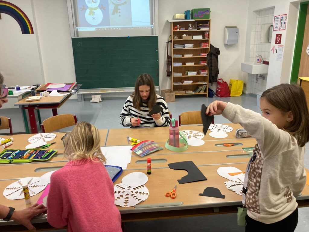 Mit großer Begeisterung wurden Weihnachtskarten gestaltet, Christbaumschmuck gebastelt, fröhliche Lieder gesungen sowie Rhythmusspiele und Volkstänze ausprobiert. Die Vielfalt der Angebote sorgte dafür, dass für jedes Kind etwas Passendes dabei war. Der erste Schnee sorgte für eine ausgelassene und fröhliche Pause!