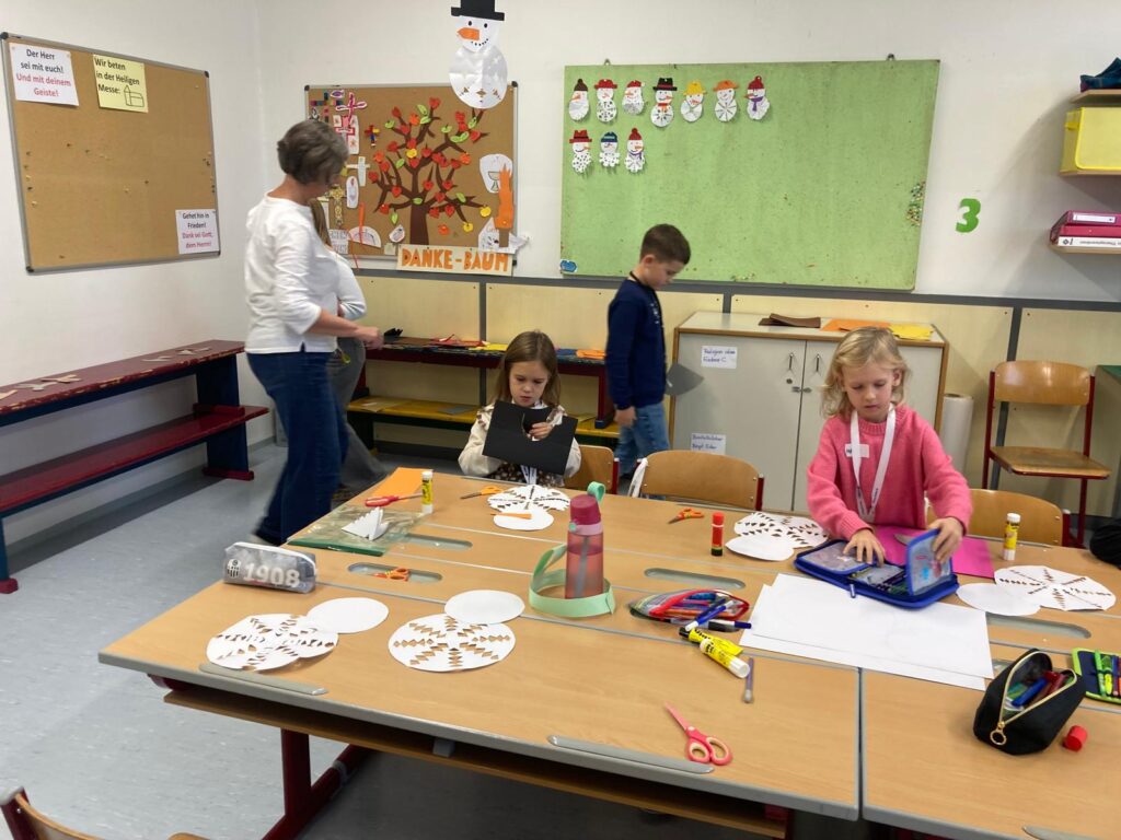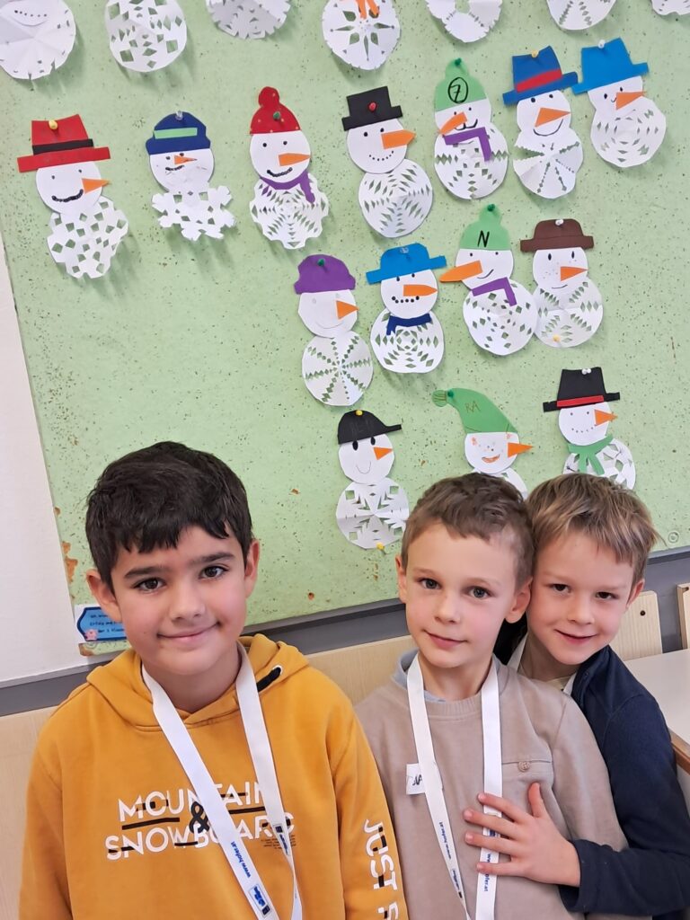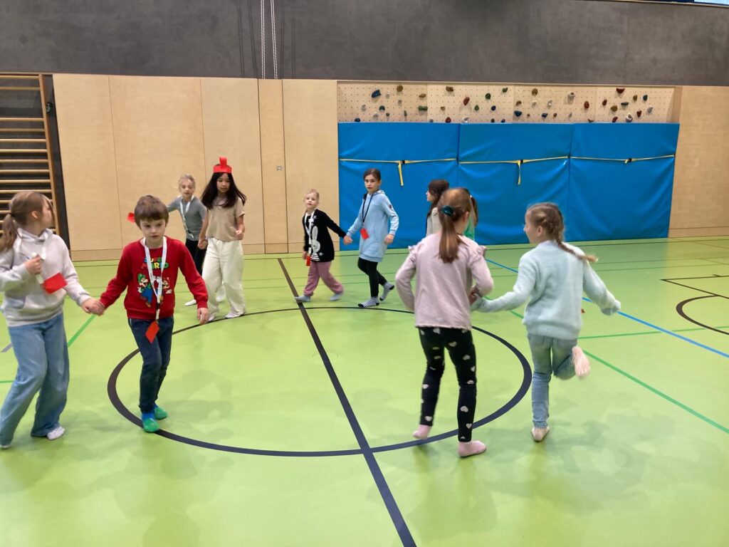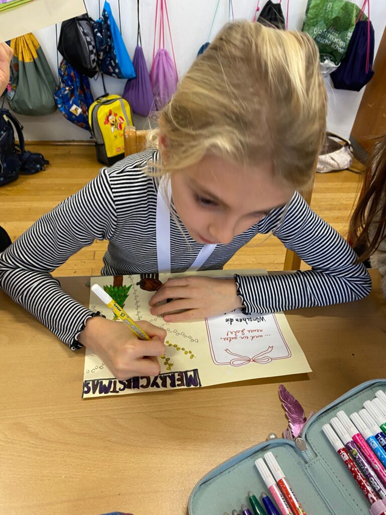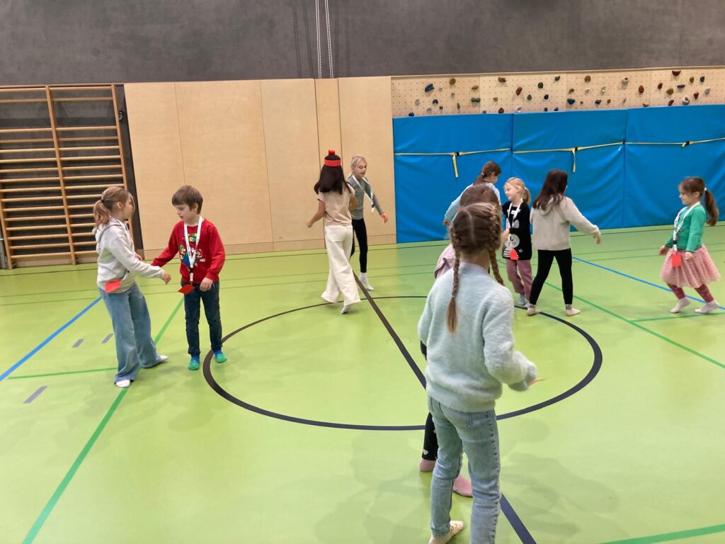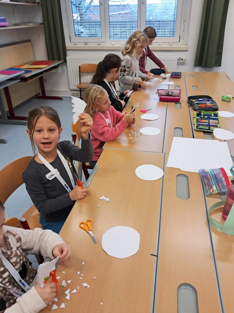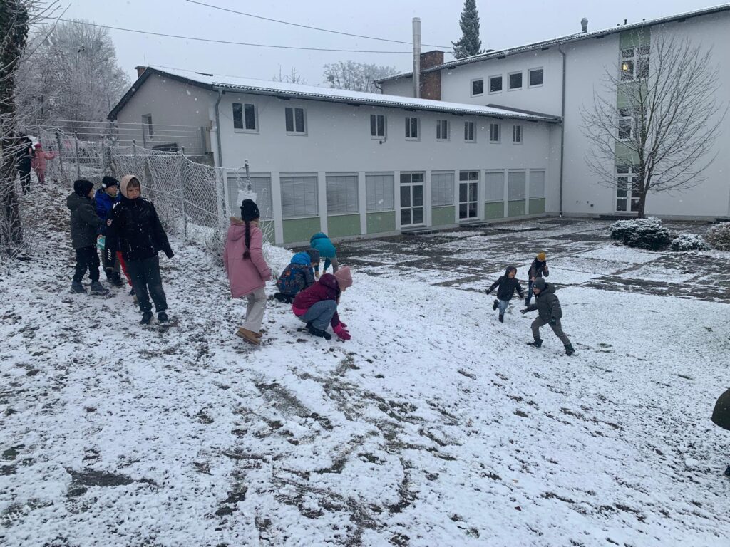 Mit großer Begeisterung wurden Weihnachtskarten gestaltet, Christbaumschmuck gebastelt, fröhliche Lieder gesungen sowie Rhythmusspiele und Volkstänze ausprobiert. Die Vielfalt der Angebote sorgte dafür, dass für jedes Kind etwas Passendes dabei war. Der erste Schnee sorgte für eine ausgelassene und fröhliche Pause!