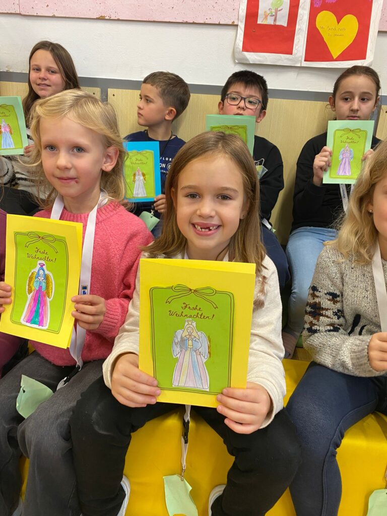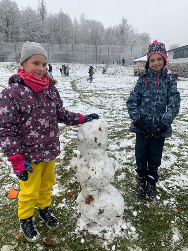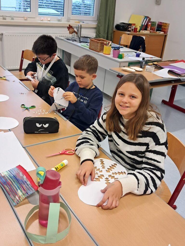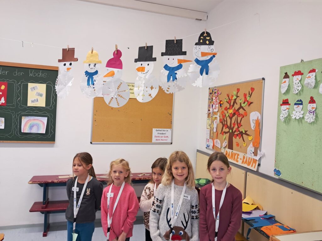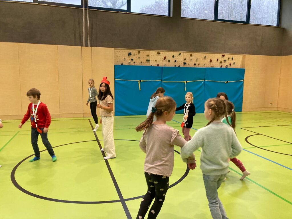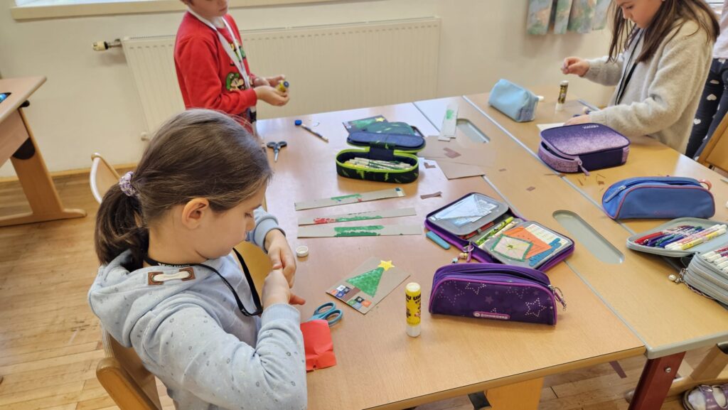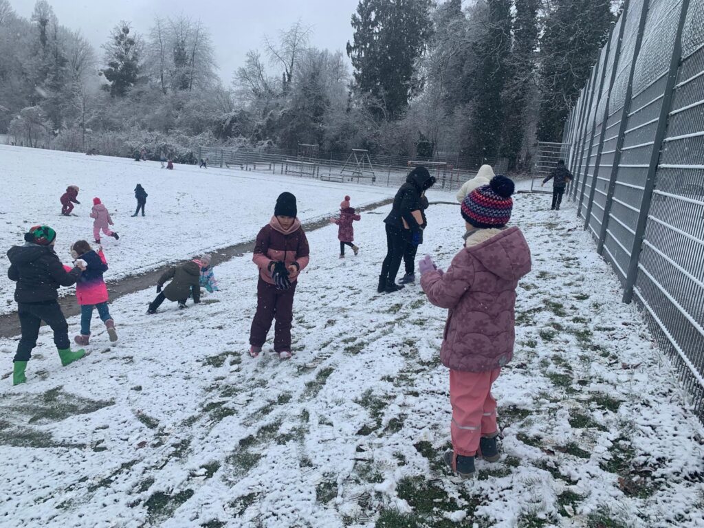 Mit großer Begeisterung wurden Weihnachtskarten gestaltet, Christbaumschmuck gebastelt, fröhliche Lieder gesungen sowie Rhythmusspiele und Volkstänze ausprobiert. Die Vielfalt der Angebote sorgte dafür, dass für jedes Kind etwas Passendes dabei war. Der erste Schnee sorgte für eine ausgelassene und fröhliche Pause!