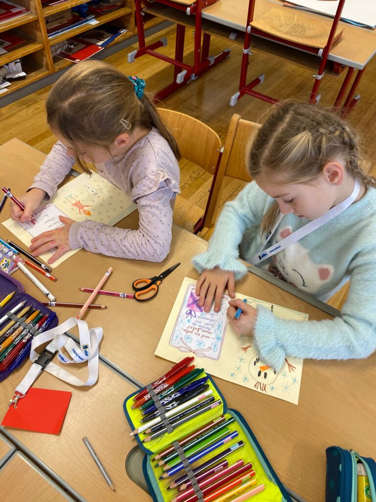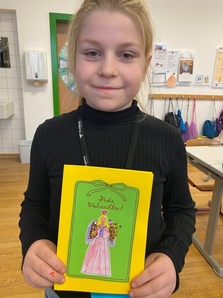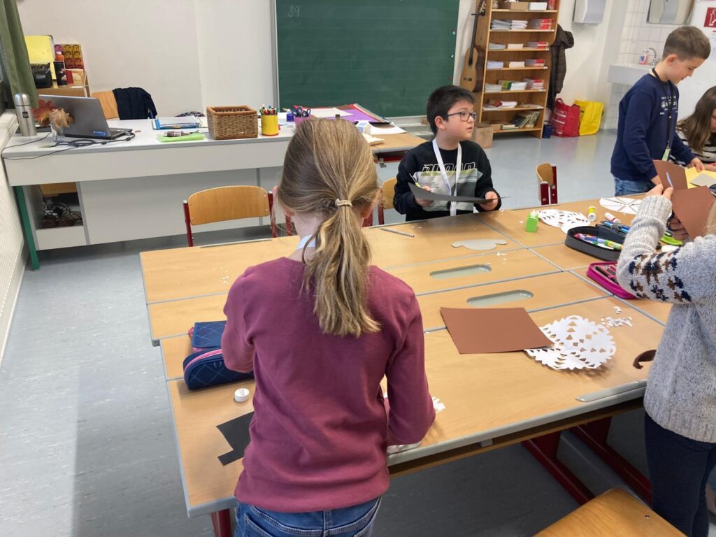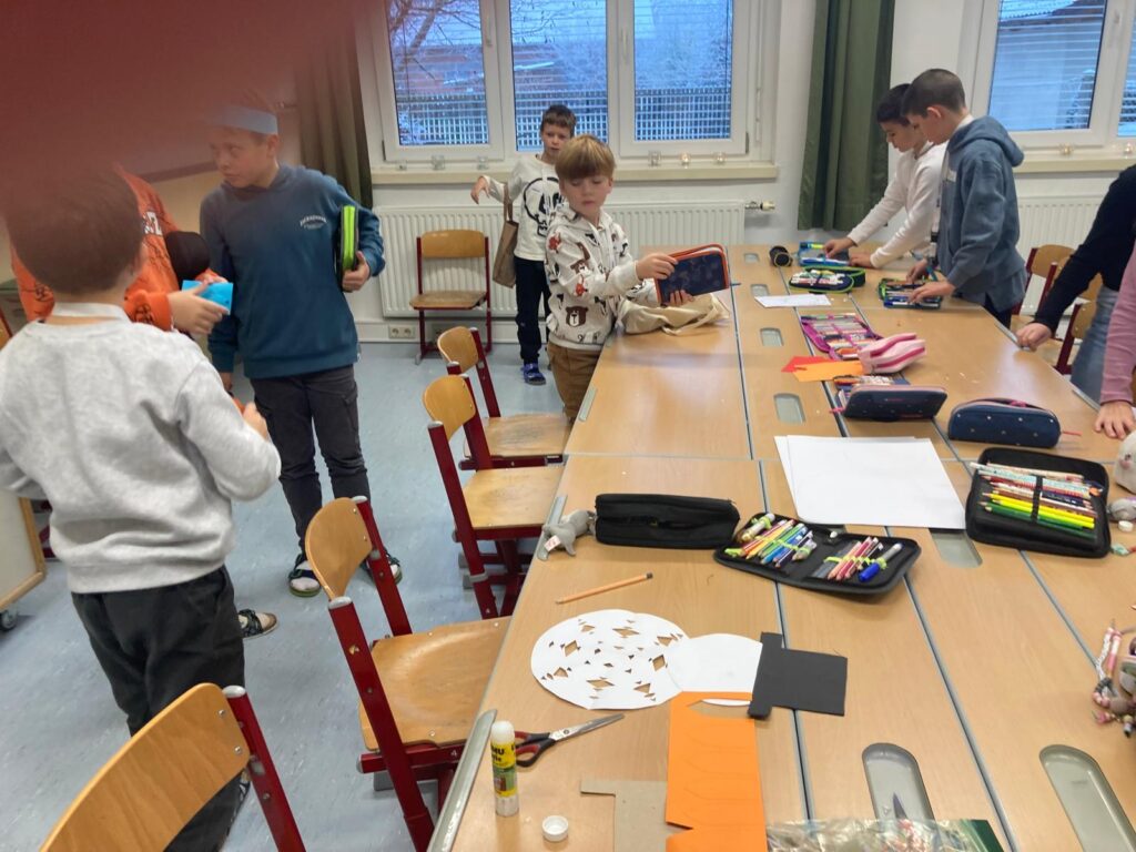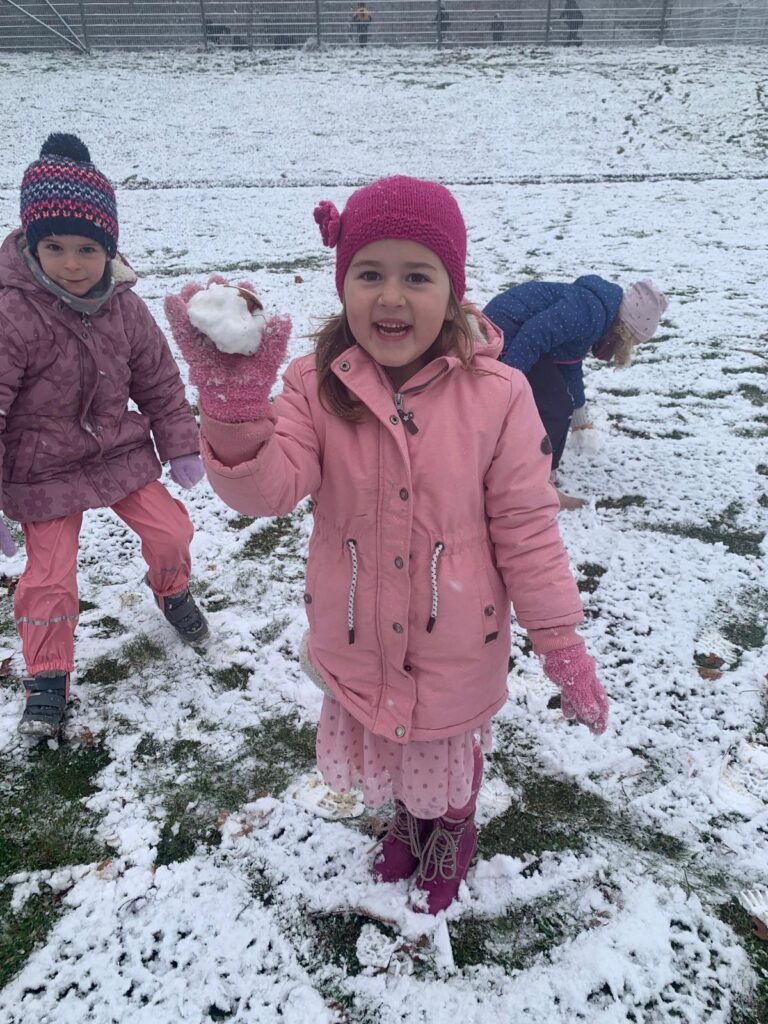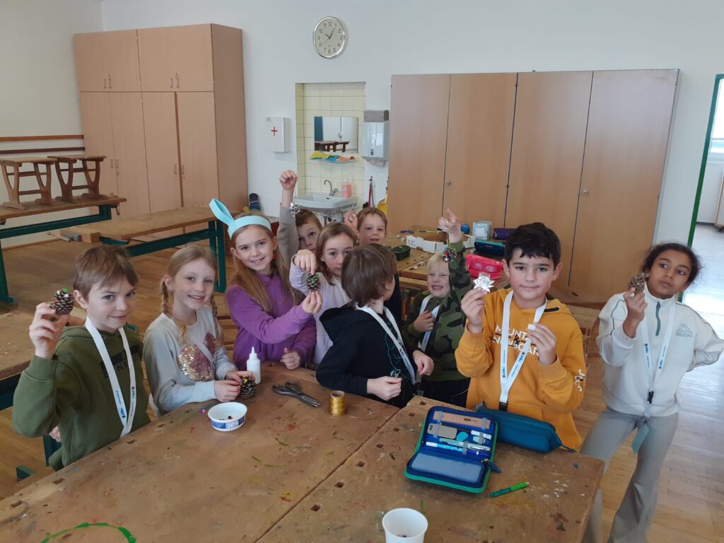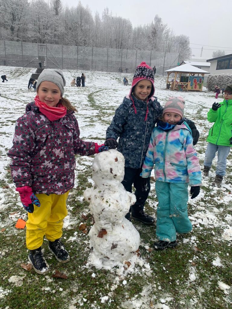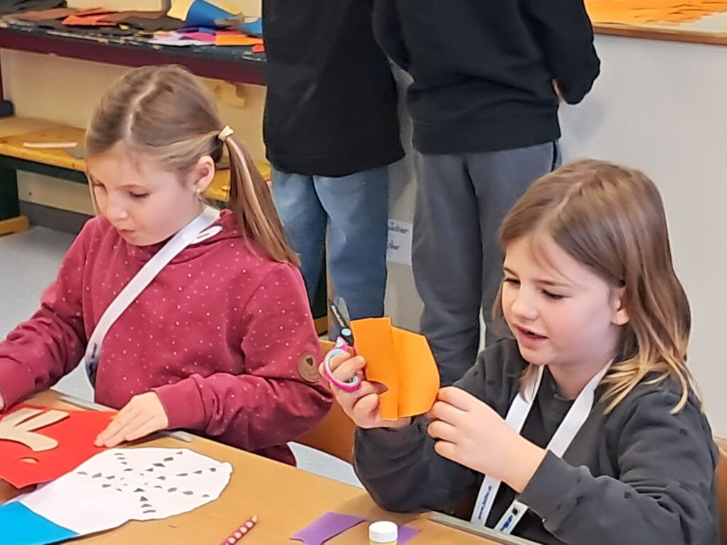 Mit großer Begeisterung wurden Weihnachtskarten gestaltet, Christbaumschmuck gebastelt, fröhliche Lieder gesungen sowie Rhythmusspiele und Volkstänze ausprobiert. Die Vielfalt der Angebote sorgte dafür, dass für jedes Kind etwas Passendes dabei war. Der erste Schnee sorgte für eine ausgelassene und fröhliche Pause!