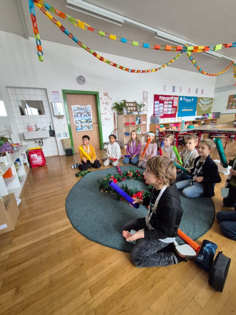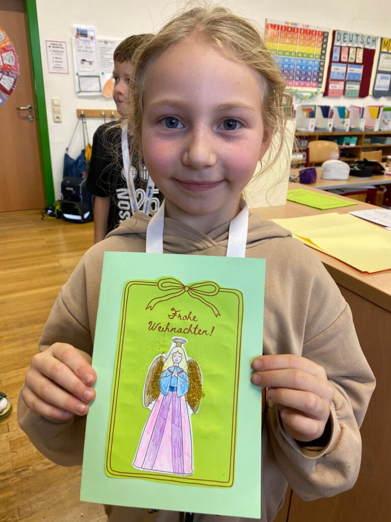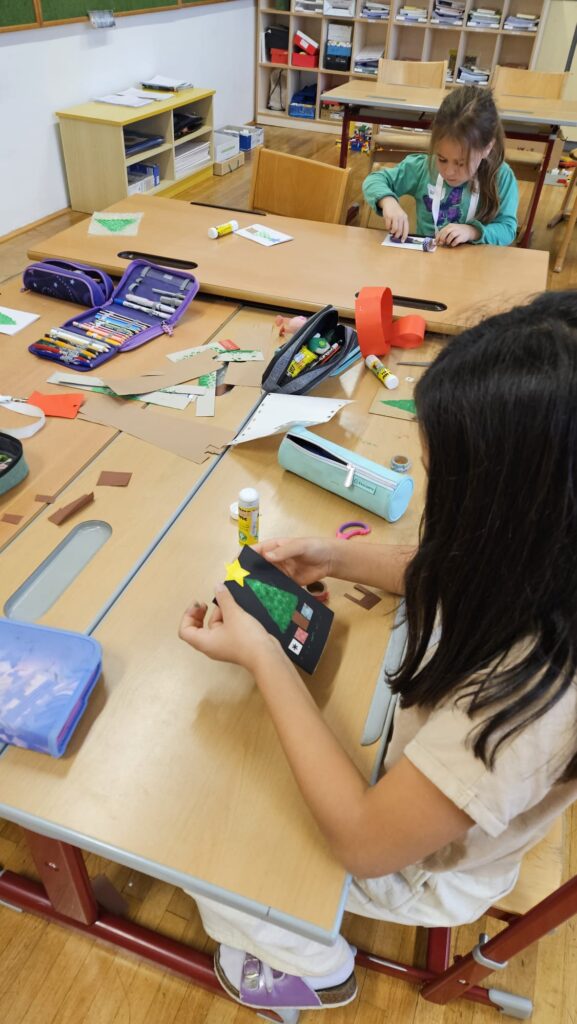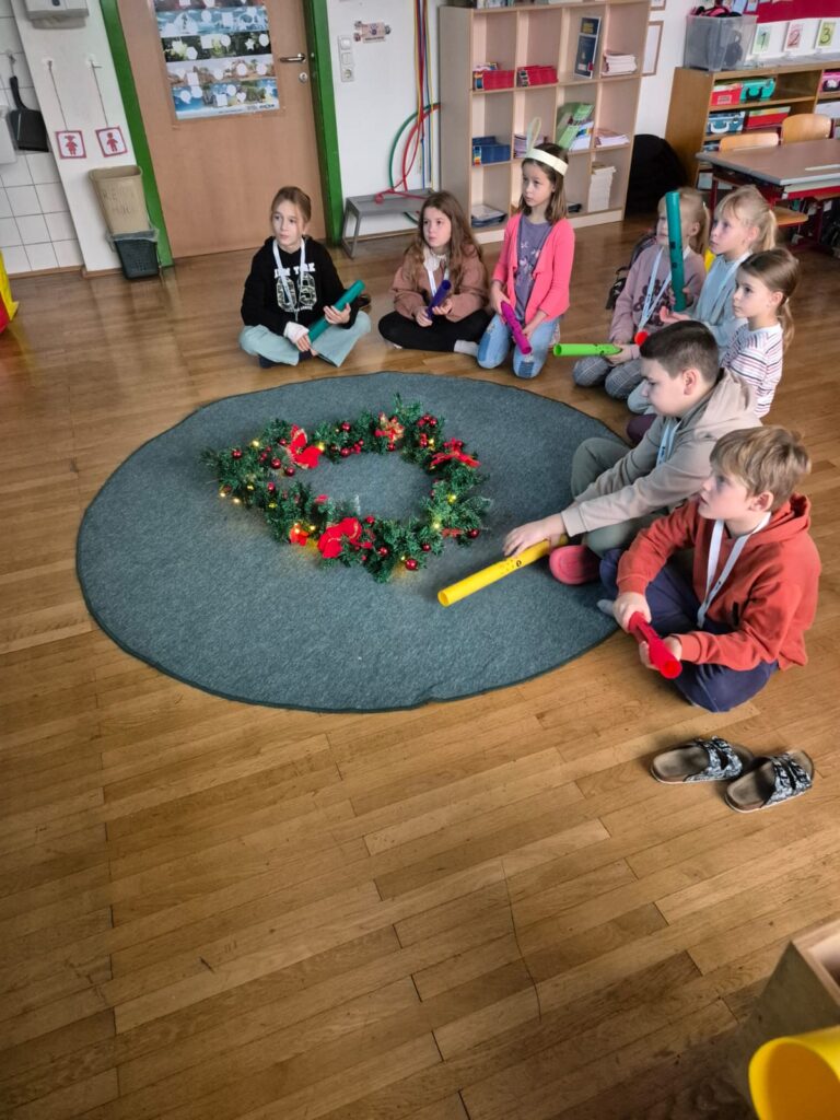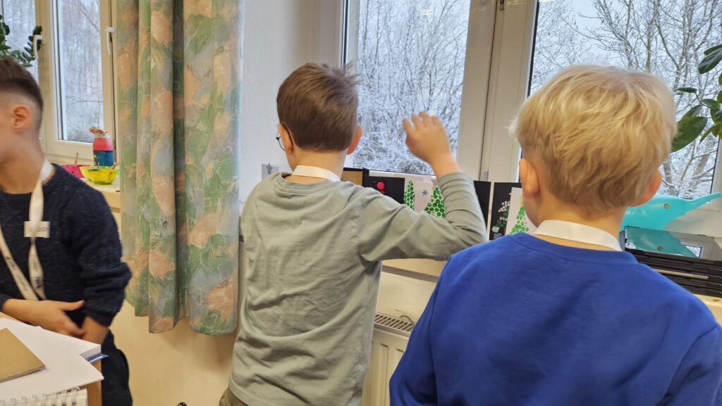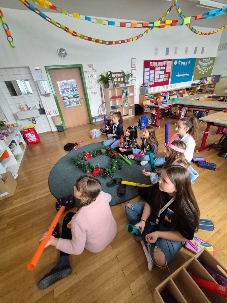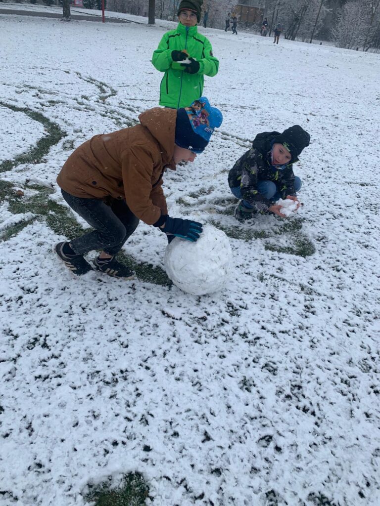 Mit großer Begeisterung wurden Weihnachtskarten gestaltet, Christbaumschmuck gebastelt, fröhliche Lieder gesungen sowie Rhythmusspiele und Volkstänze ausprobiert. Die Vielfalt der Angebote sorgte dafür, dass für jedes Kind etwas Passendes dabei war. Der erste Schnee sorgte für eine ausgelassene und fröhliche Pause!