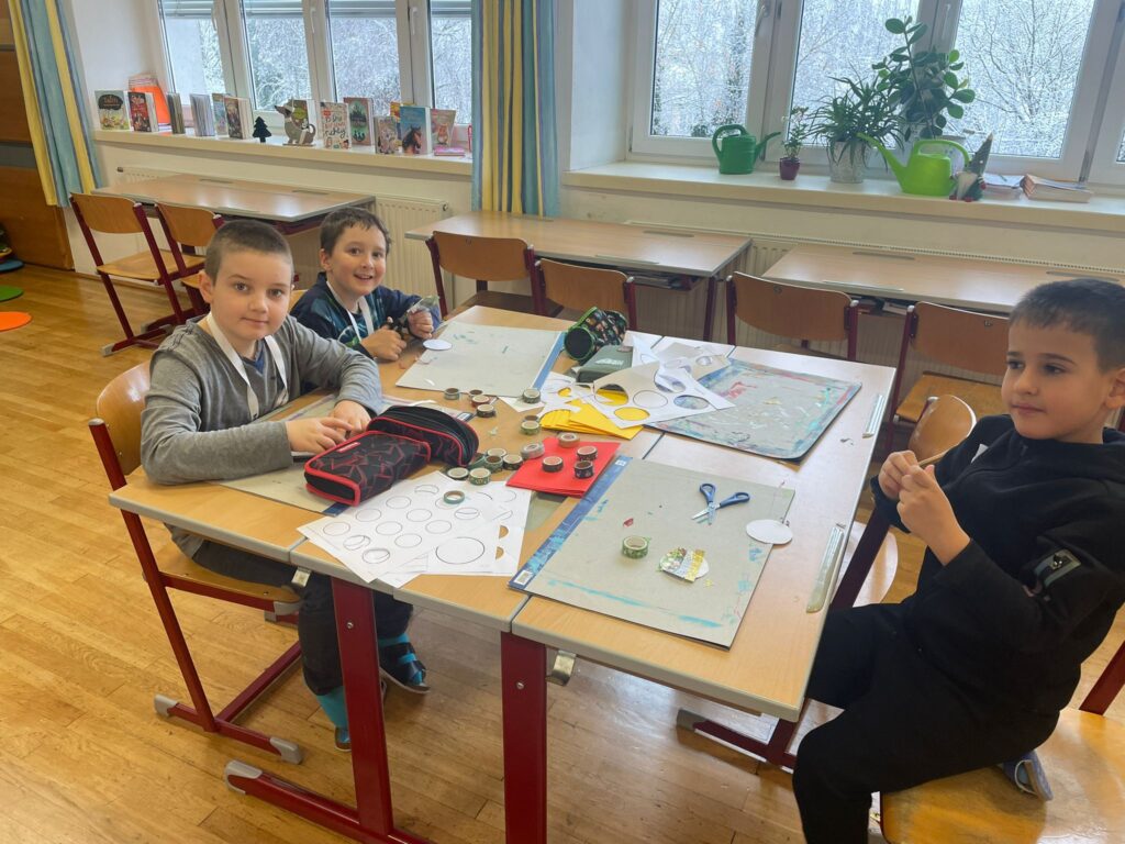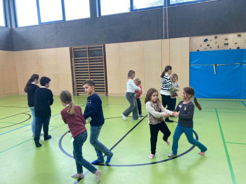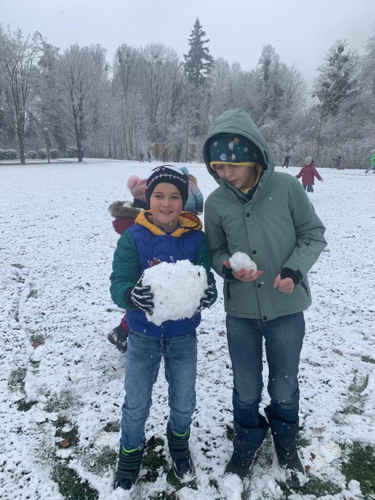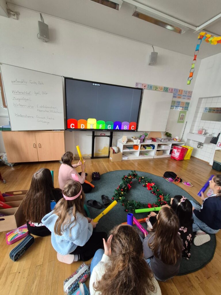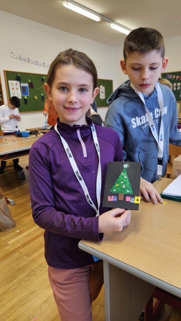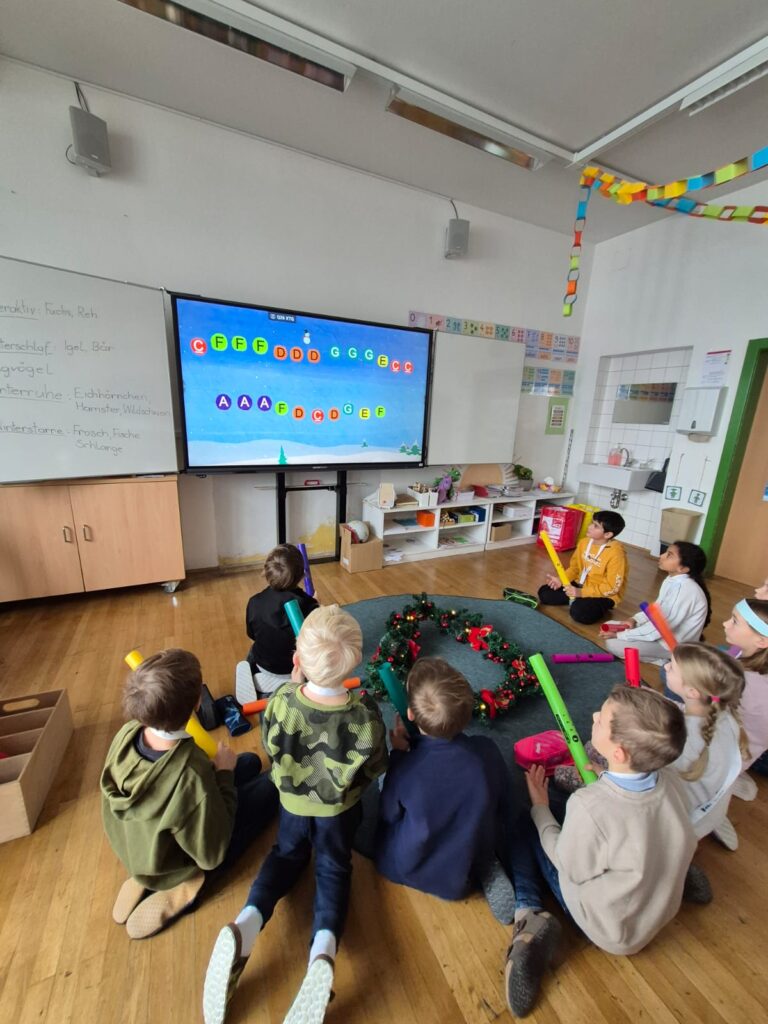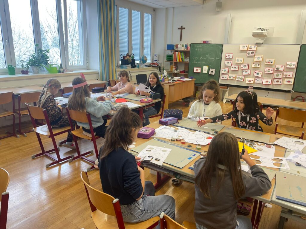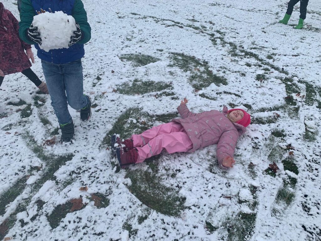Mit großer Begeisterung wurden Weihnachtskarten gestaltet, Christbaumschmuck gebastelt, fröhliche Lieder gesungen sowie Rhythmusspiele und Volkstänze ausprobiert. Die Vielfalt der Angebote sorgte dafür, dass für jedes Kind etwas Passendes dabei war. Der erste Schnee sorgte für eine ausgelassene und fröhliche Pause!